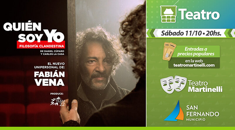 El sábado 11 a las 20h, en el Teatro Martinelli, se presentará el reconocido actor argentino Fabián Vena, regresa a escena con su unipersonal “Quien soy yo: Filosofía Clandestina”, en el que personificará a un profesor de Filosofía que, tras ser expulsado de la universidad, decide continuar su vocación en el anonimato, donde encuentra su verdadera voz.