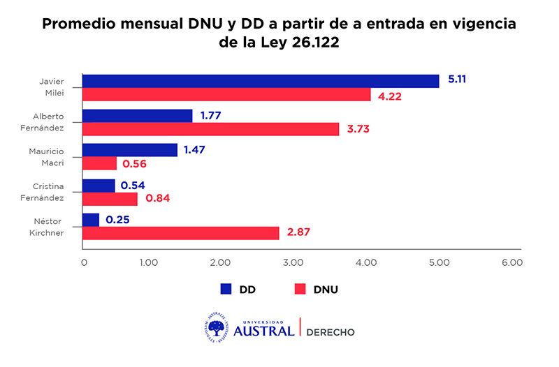 Si bien la pandemia y sus consecuencias dispararon la cantidad de DNU y DD durante el año 2020, la falta de una mayoría consolidada en el Congreso mantuvo elevado el promedio de estos decretos durante el resto del mandato de Fernández. Si se compara la presidencia de Alberto Fernández con la de Mauricio Macri, se pasó de un promedio mensual de 0,56 a 3,73 DNU y de 1,47 a 1,77 DD. Esta falta de mayoría legislativa se profundizó al asumir la presidencia de Milei, donde el oficialismo no alcanza un tercio en ninguna de ambas Cámaras. En lo que lleva de mandato, el promedio mensual de DNU pasó a 4,22 y el de DD a 5,11.