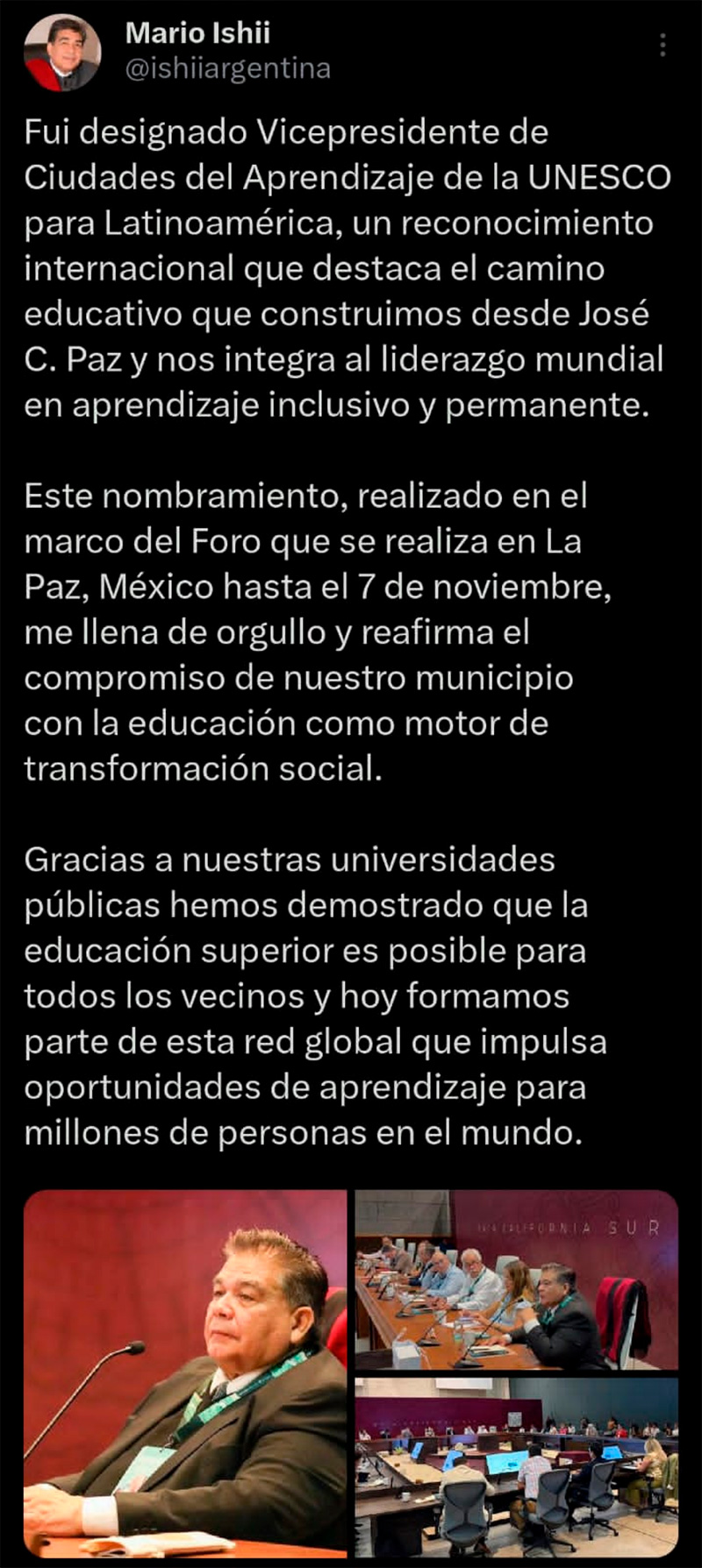 El intendente Municipal de José C. Paz, Mario Alberto Ishii, fue designado vicepresidente de Ciudades del Aprendizaje de la UNESCO para Latinoamérica, un reconocimiento internacional que destaca la transformación educativa que viene impulsando en José C. Paz. La distinción llegó durante el III Foro de Ciudades del Aprendizaje de Latinoamérica, que se desarrolla en La Paz, Baja California Sur, México, y reúne a 56 ciudades de la región junto a expertos internacionales.