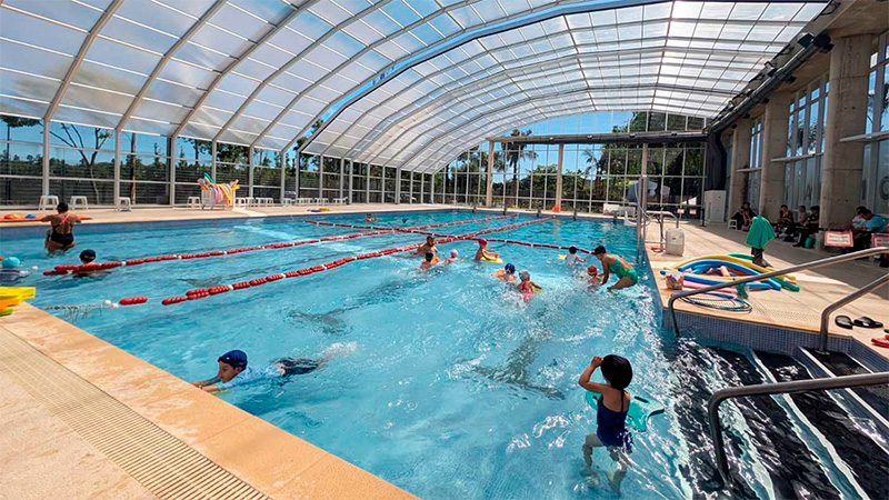 El nuevo natatorio municipal – ubicado en la intersección de las calles Antártida Argentina y Corrientes – consta de un total de 800m2 que incluye una pileta semiolímpica con techo corredizo, vestuarios, sala de máquinas y consultorios médicos.
