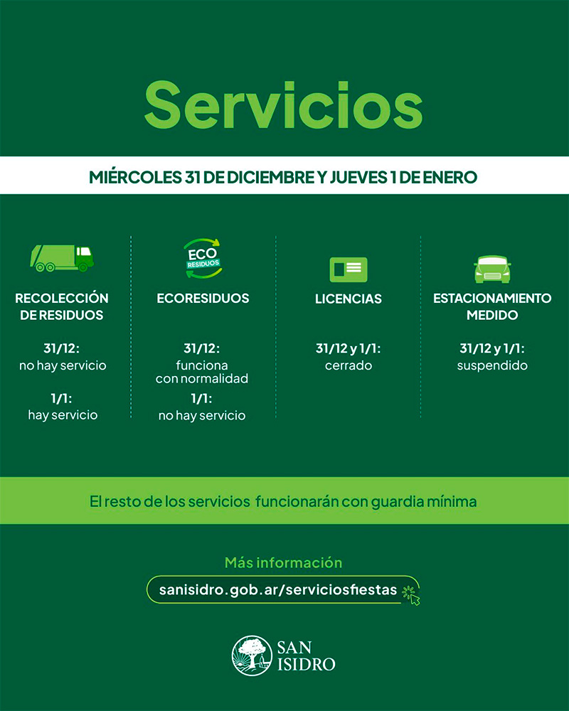 Durante las fiestas, los servicios públicos municipales de San Isidro operarán con horarios especiales por el asueto del 31 de diciembre, y el feriado del 1 de enero, Año Nuevo.