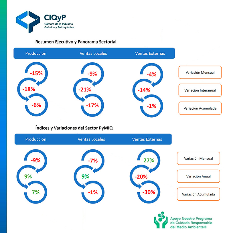 El informe mensual confeccionado por la Cámara de la Industria Química y Petroquímica (CIQyP®), sobre el panorama sectorial, indicó que durante noviembre de 2025 la producción del sector registró una disminución del 15% respecto del mes anterior. En comparación con el mismo mes del año pasado (noviembre 2024), la baja fue del 18%. El acumulado de los once meses del año registró una caída del 6%.