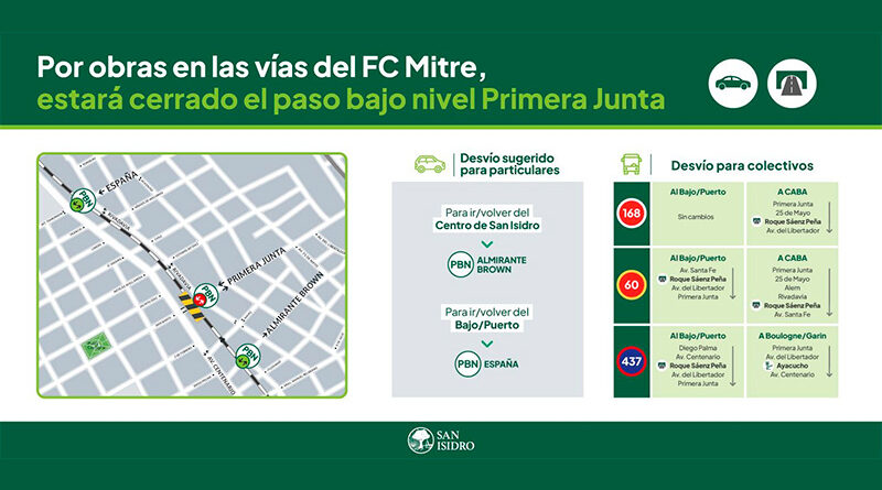 El Paso Bajo nivel Primera Junta en San Isidro permanecerá cerrado por obras durante quince días, según lo dispuesto por Trenes Argentinos. Desde la empresa del Estado Nacional que lleva adelante la obra, aclararon que se tratan de refacciones “urgentes y fundamentales” para aumentar los niveles de seguridad y confiabilidad de los usuarios.