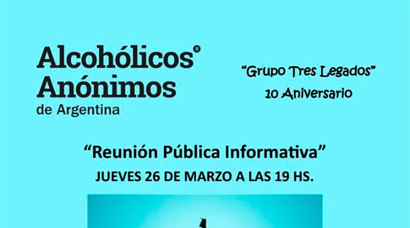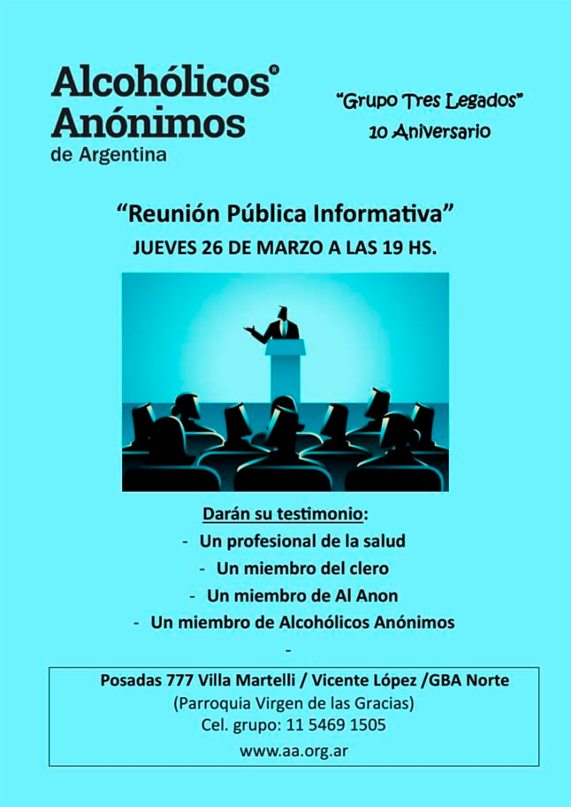 El jueves 26 de Marzo, a las 19 hs., el Grupo Tres Legados, de Alcohólicos Anónimos, ha organizado una Reunión Pública con entrada libre y gratuita con el fin de tratar y analizar temas referidos al alcoholismo en general y su recuperación. La reunión se realizará en la Parroquia Virgen de las Gracias, Posadas 777, Villa Martelli.