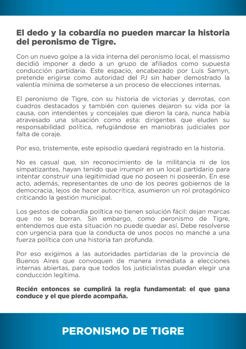 A través de un comunicado (ver abajo), el sector del PJ que responde al actual intendente Julio Zamora volvió a reclamar elecciones internas en su partido con la participación de todos y el voto popular. “El que gana conduce y el que pierde acompaña”, dice el documento.